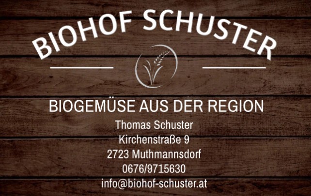 Der Biohof Schuster ist ein liebevoll geführter biologischer Familienbetrieb in Muthmannsdorf am Fuße der Hohen Wand. Unter der Leitung von Thomas Schuster baut die Familie seit mehreren Jahren in Handarbeit ein vielfältiges Sortiment an saisonalem Bio-Gemüse an – allen voran Bio-Knoblauch, der als besonderes Produkt der Region besondere Aufmerksamkeit erhält. Ergänzt wird das Angebot durch Zwiebeln, Erdäpfel, Zucchini, Gurken, Tomaten und Kürbisse.
